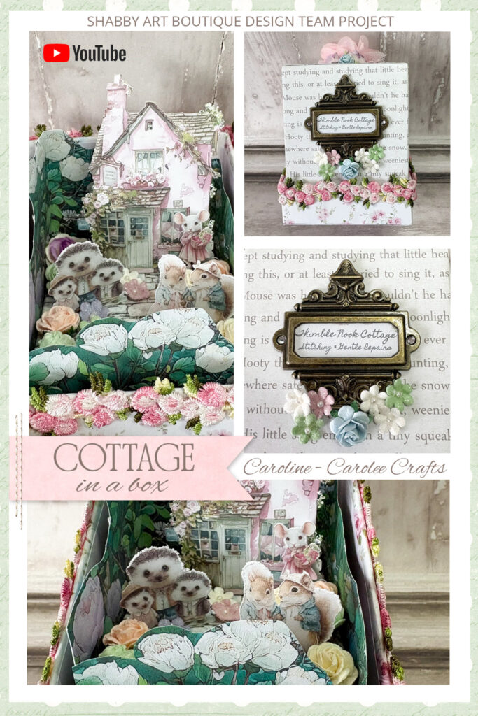 The outside is beautifully decorated with papers from the kit, but when the lid is lifted, you’ll find a miniature 3D diorama of Seraphina’s Thimble Nook Cottage, complete with a dormouse, the hedgie family, and Mr & Mrs Squirrel.