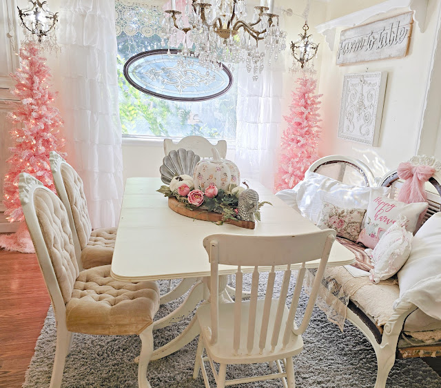 Currently styled with shabby pumpkins and roses, it’s a stunning blend of vintage elegance and seasonal charm.