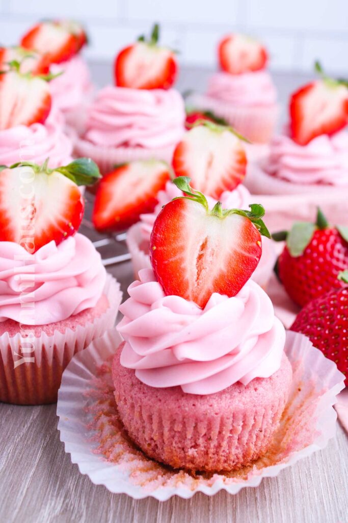 Gina has shared the recipe for the prettiest strawberry cupcakes… fluffy, full of sweet strawberry flavour, and topped with a silky smooth strawberry cream cheese frosting.