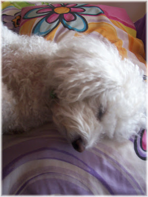 Okay…..so now she has changed positions but still she has her head on the pillow,laying on her back like a human. Now I am feeling slightly envious. How come she sleeps the day away while I keep plodding on? I’m in need of a Nana nap after all that typing this afternoon. Sooooo, here is my dilemma: Do I kick by faithful buddy out of the bed and take her warm spot? or Do I snuggle up to her and have ’40 winks’? Hhmmm……. you’ll have to guess what I did!!