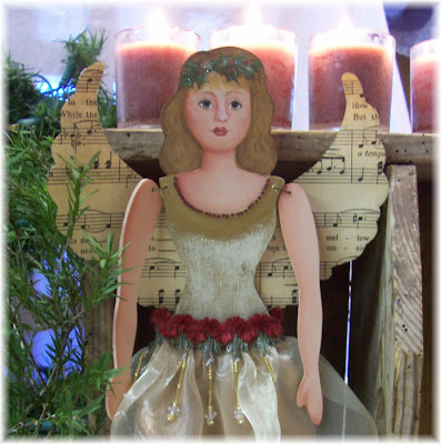 Here’s my Vintage Angel. She is made from MDF and wears a gorgeous organza and silk dress adorned with pretty trim and lots of beading. Hmmm….having a bit of a beading fetish at present. Anyway, my vintage Angel has a crackled worn looking torso and wings made from old music sheets. You could use old buttons, rhinestones, old jewellery or any other old bits and pieces you have to embellish her.