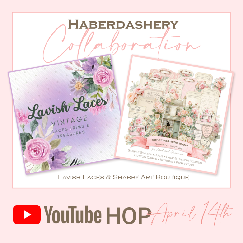 You’ll find lace boards, button cards, bobbins, sewing ephemera, labels, and vintage shop-style pieces designed to mix beautifully with real lace and trims.