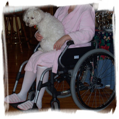 I felt well enough to get out of bed in the wheelchair for a few hours this morning and I didn’t waste a moment of it. As you can see, Gypsy the studio/bed buddy was quick to take her place on my lap.